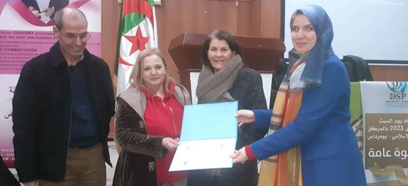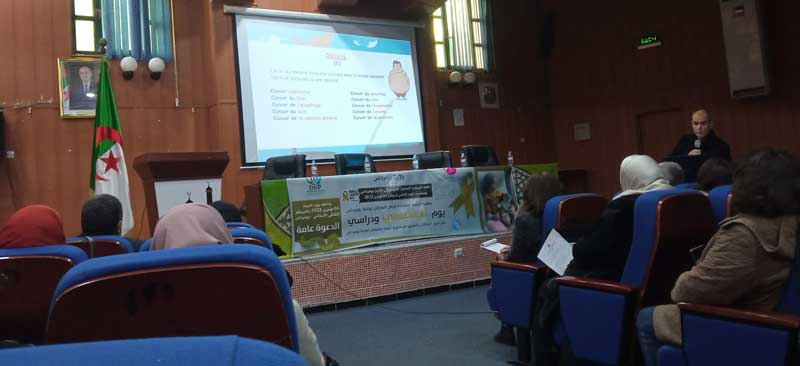 بمناسبة اليوم العالمي لمرض السرطان، وتحت الرعاية السامة للسيد والي ولاية بومرداس، نظمت يوم السبت 4 فيفري 2023 جمعية الرحمة لمساعدة مرضى السرطان لولاية بومرداس برئاسة السيدة مليكة رازي، بالتنسيق مع مديرية الصحة والسكان لولاية بومرداس، على مستوى المركز الثقافي الإسلامي ببومرداس، يوما تحسيسيا وتوعويا حول مرض السرطان. حيث شهد اليوم الدراسي حضور أطباء مختصيين وأخصائيين نفسانيين وأخصائين في علم الإجتماع، وعرف اليوم مداخلات مفيدة توعوية من الحضور الكريم.